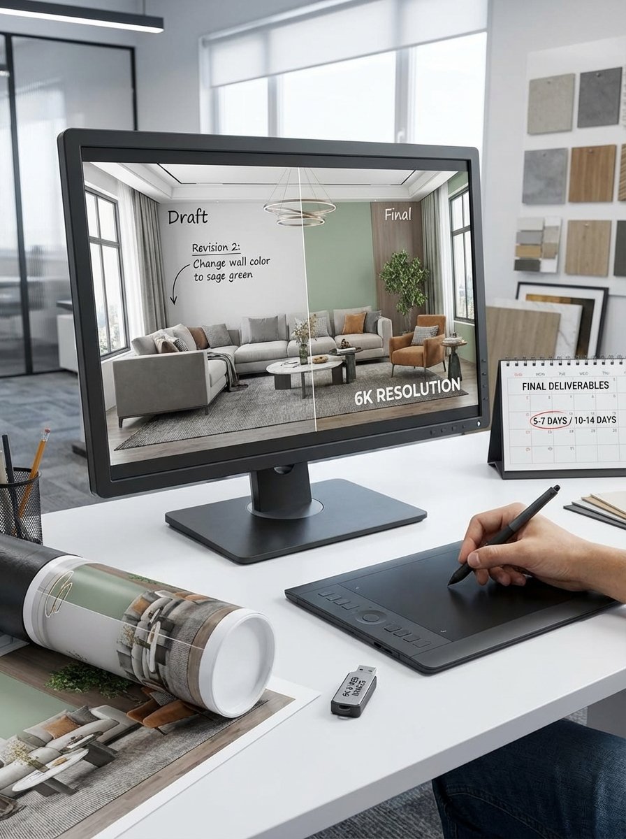 Most interior rendering companies take 1-2 weeks for first drafts. We're faster because we've optimized our workflow specifically for interior visualization. The CGarchitect community has highlighted how specialized studios deliver faster without sacrificing quality.